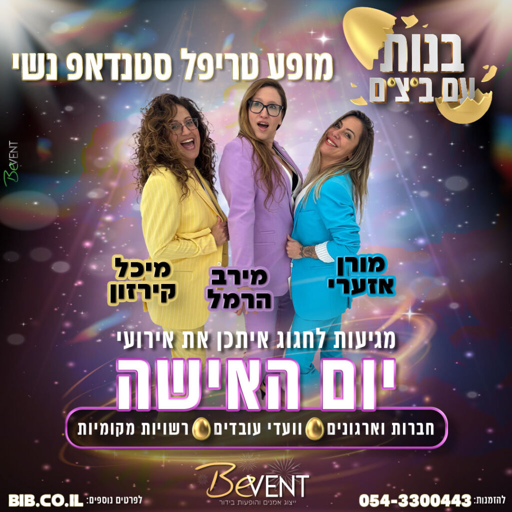 הרכב הטריפל סטנדאפ נשי בנות עם ביצים על הבמה עם הומור חד, אנרגיה מטורפת, בדיחות שיחתכו את השגרה ותזכורת שנשים לא רק מצחיקות – הן קורעות מצחוק!